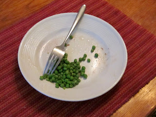 At some point during my meal, I went to the kitchen to get something and looked back at my plate. The tender coral colored salmon fillet was gone. Only stray greens and pieces of red onion were left of my salad. But my plate was still full of peas.